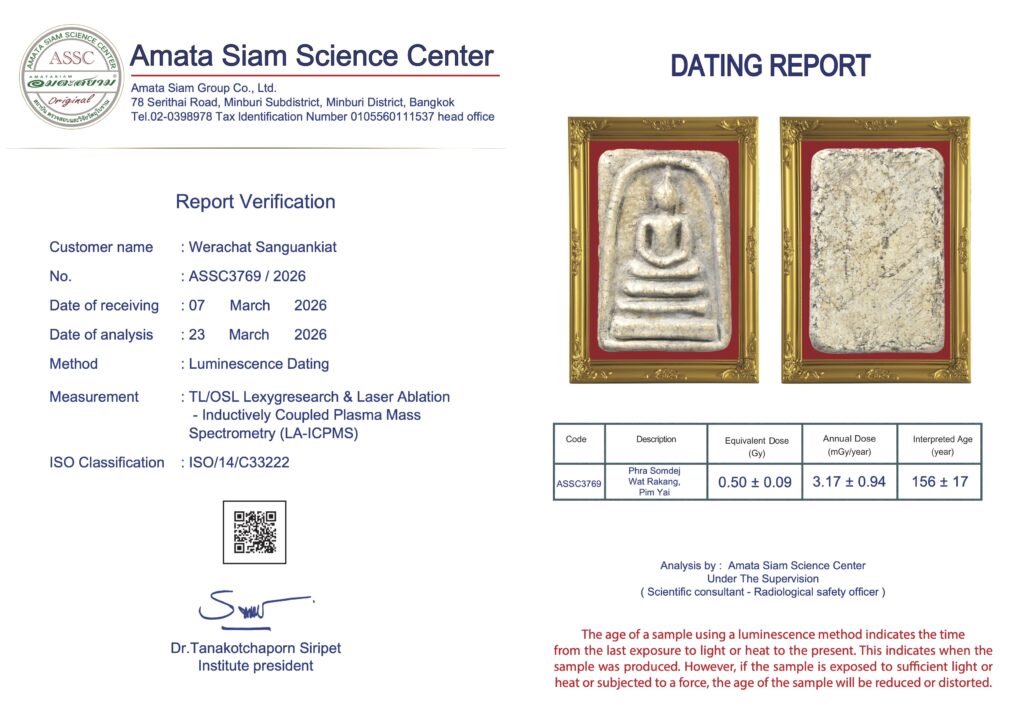 The scientific authentication of Phra Somdej Wat Rakang represents a shift from subjective “eye-judging” to empirical data. Using Optically Stimulated Luminescence (OSL), scientists can determine the last time the materials were exposed to intense light or heat. Since Phra Somdej is a lime-based amulet (made from crushed sea shells) that did not undergo high-heat firing like clay amulets, OSL is used to analyze the sedimentation age or the “re-crystallization” period of the calcium carbonate since it was molded approximately 150–160 years ago. This effectively distinguishes authentic 19th-century pieces from modern chemical-pressed imitations.